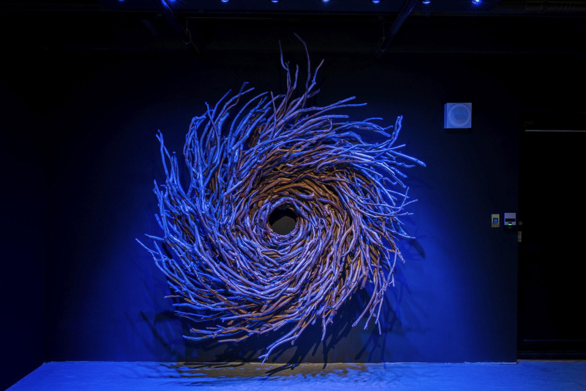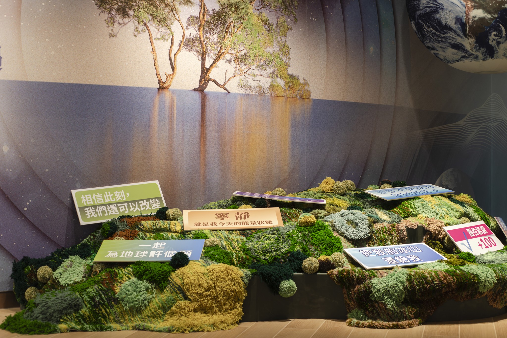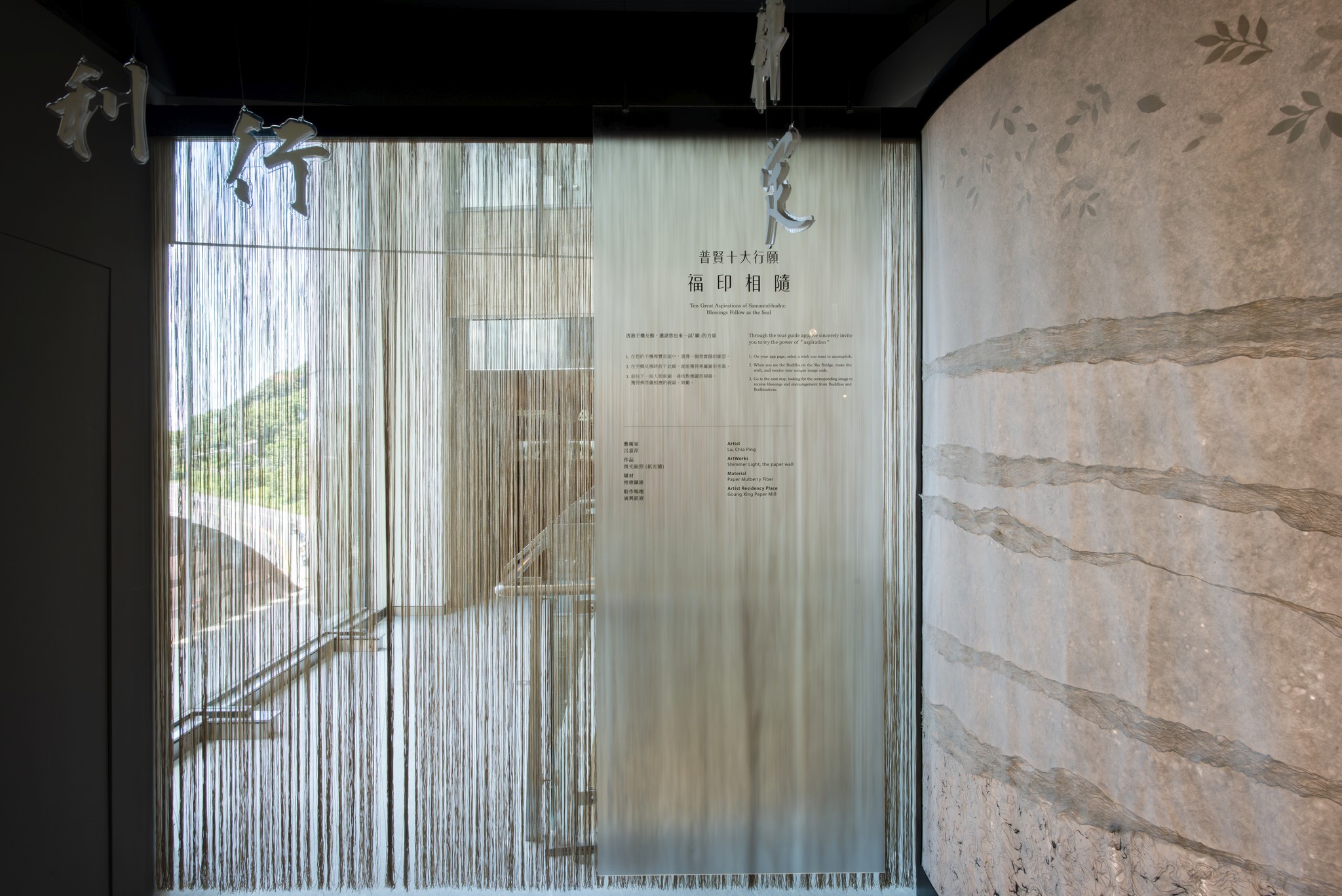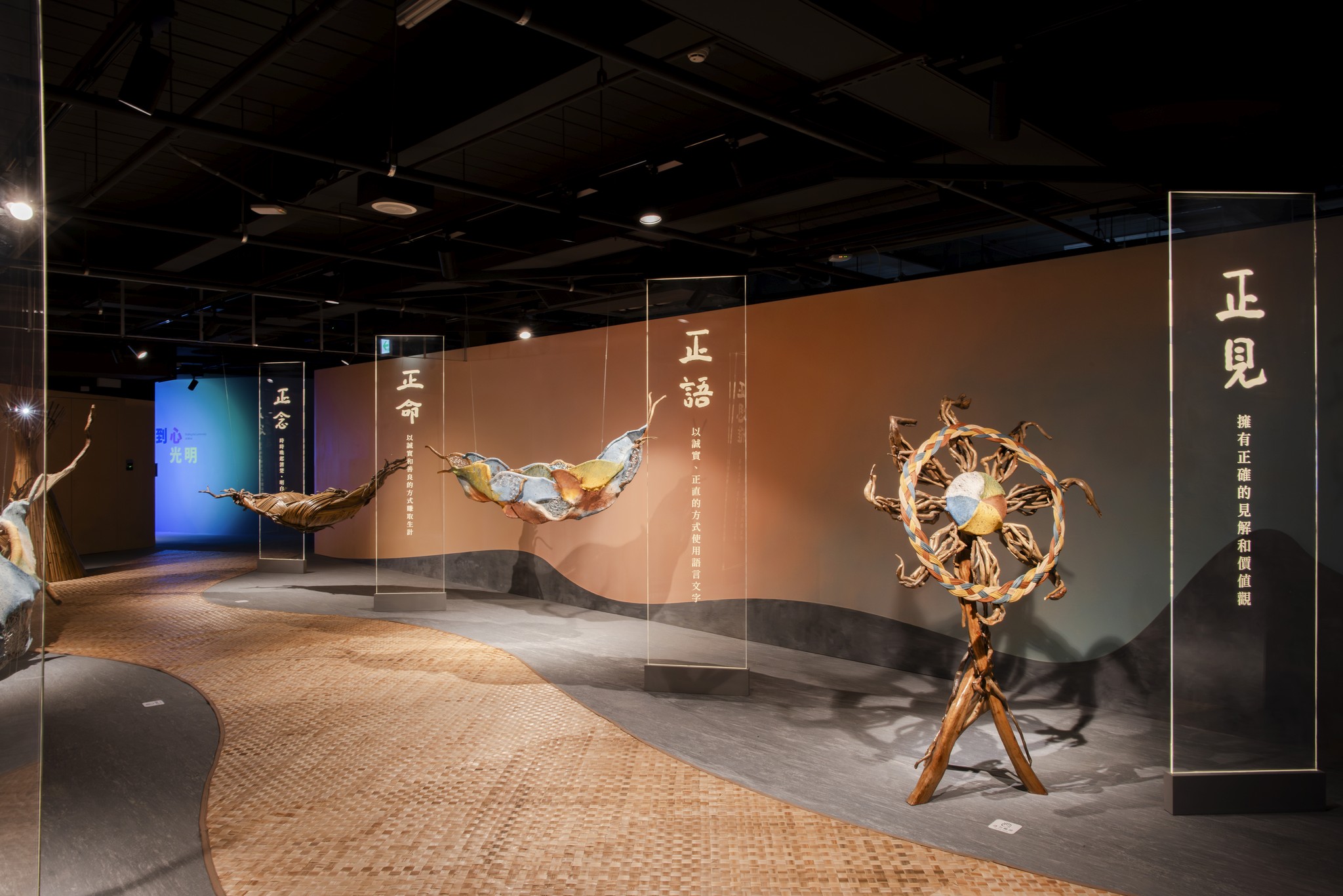 世間興衰,如同海浪起落,總隨因緣聚散而變化無常。若未能明白得失的真實樣貌而執著 則會一再捲入苦海浮沈其中。佛陀所教導的八正道,猶如堅固的船筏,能帶領世人培育智慧奥良善的行為,調伏散亂的內心,平等地面對世間一切的順逆際遇,朝遠方光明所指引的寂靜、無苦、安樂穩舵前行。 藝術家取材自然,以漂流木、黃藤、構樹皮布與竹月交織漩渦與船舵。走在以八正道為軸的旅程,船身隨漩渦旋繞,彷彿牽引著方向,引領觀者踏上一段人生旅程。不僅是一場身體的行走,更是心靈的穿越。