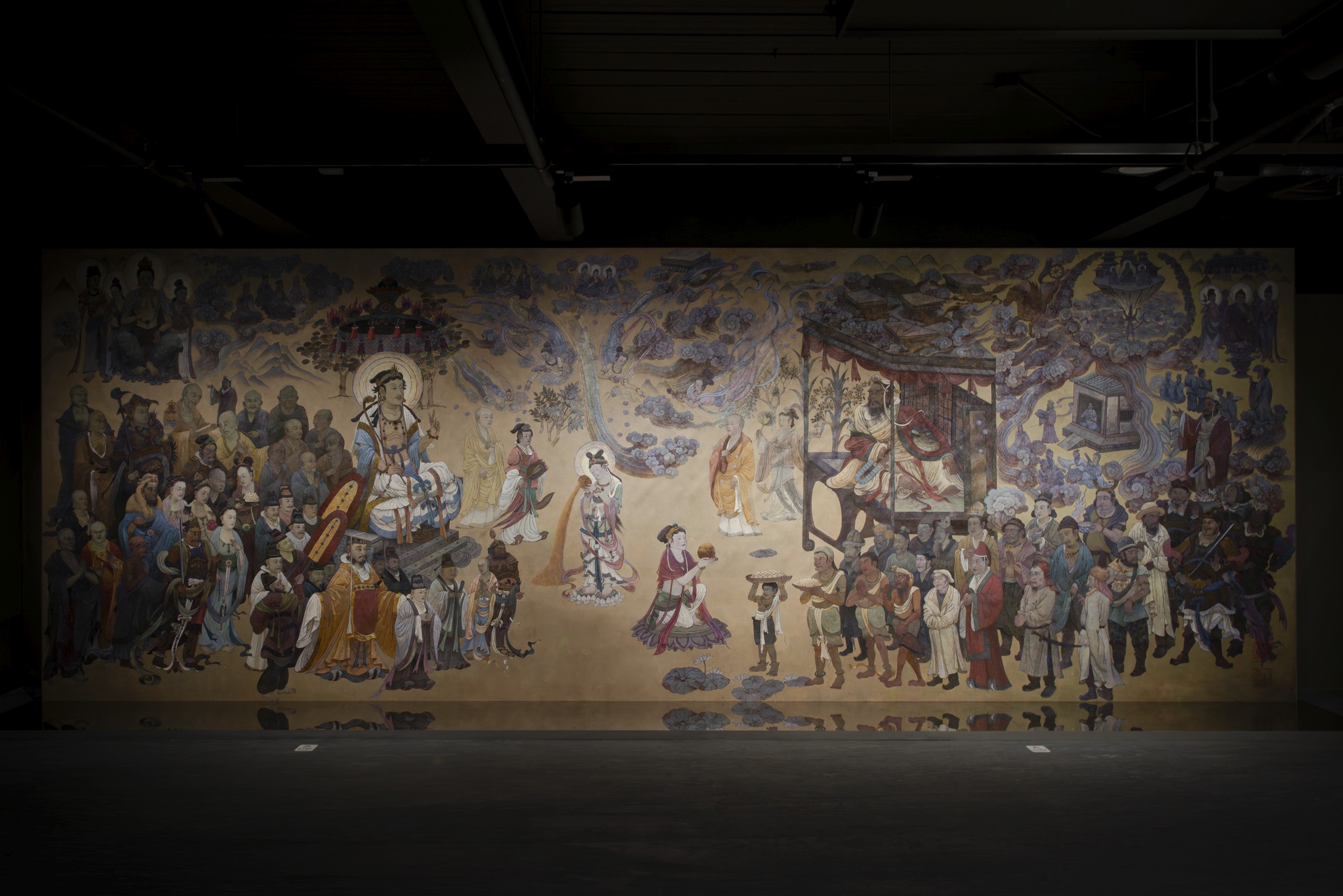 《維摩詰所說經》以維摩詰居士為主角,從他的日常行誼以及稱病說法,呈現出一位深入佛法員論修行者的智慧與風範。他深達空性智慧,自在無礙、遊戲神通同時也具大慈悲心念,不舍一切衆生,因此以空性與大悲的雙運來度化眾生。此幅《維摩詰所說經》畫作,構圖參照敦煌壁畫,以油畫技法呈現經典中的14段主題故事,長達八公尺的畫面徐徐展開,如同一場莊嚴的法會正開場。純亞麻畫布上層疊油彩與複合媒材,交織出語言的迴響與沉默的重量。引領觀者於當代感官語言,重返那場關於佛法、生命與解脫的宏大對話。